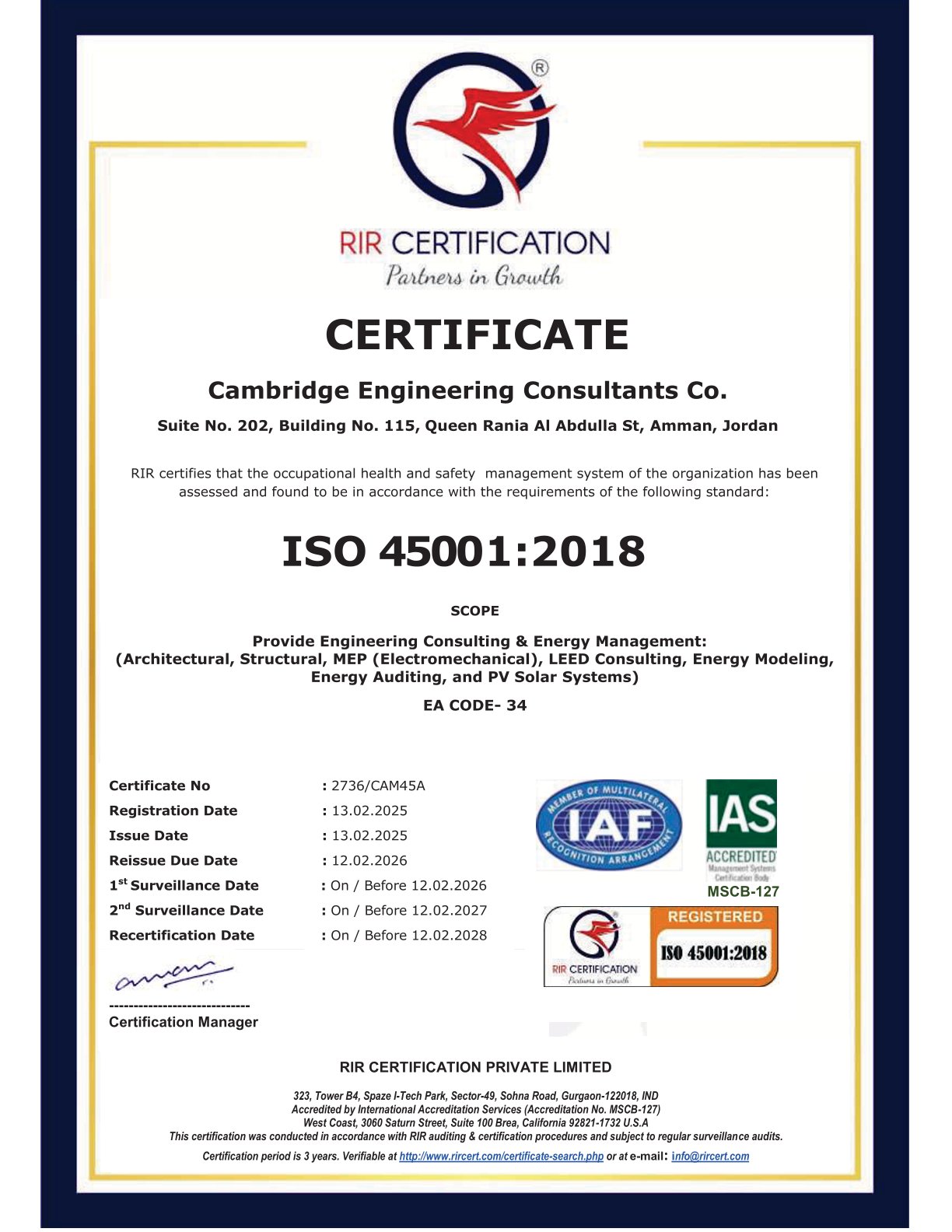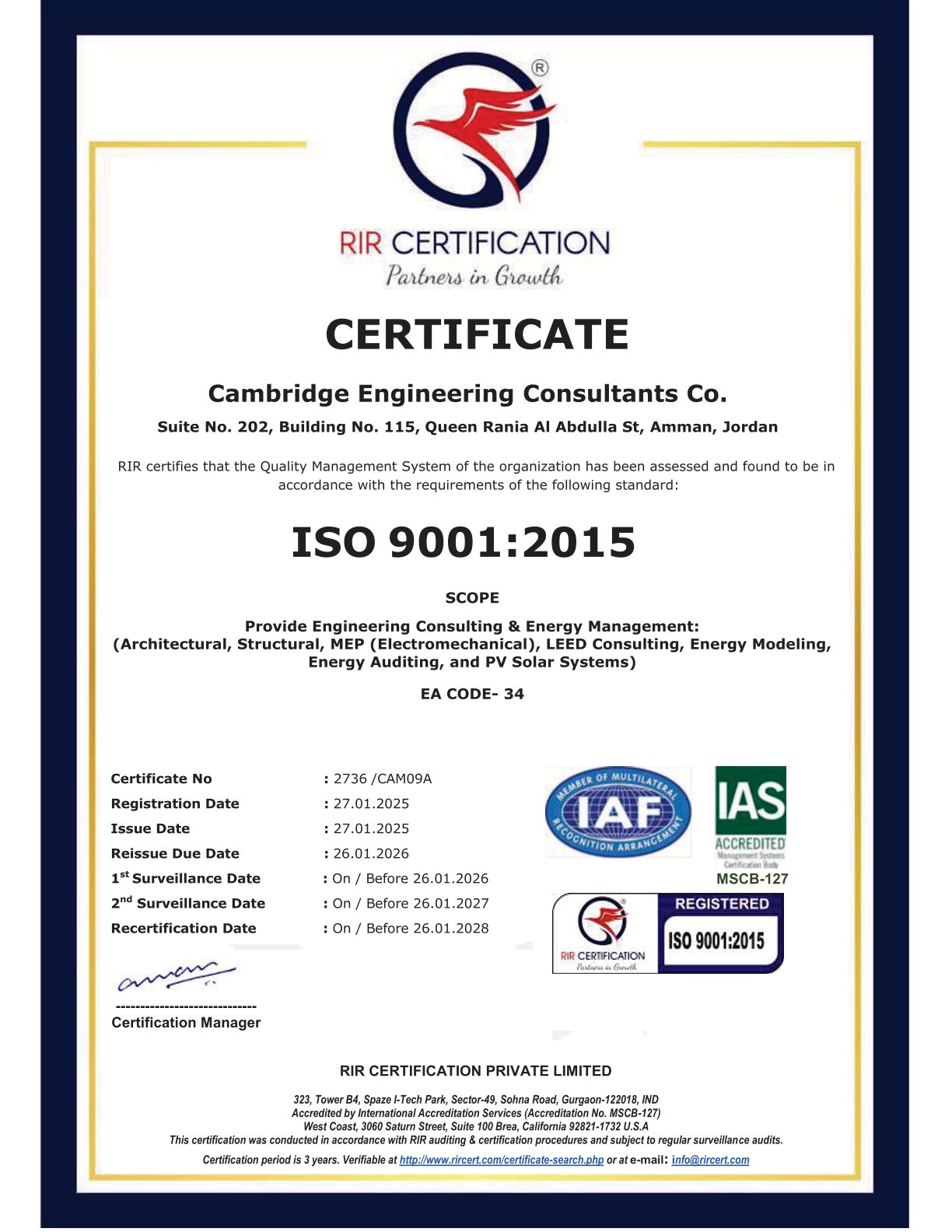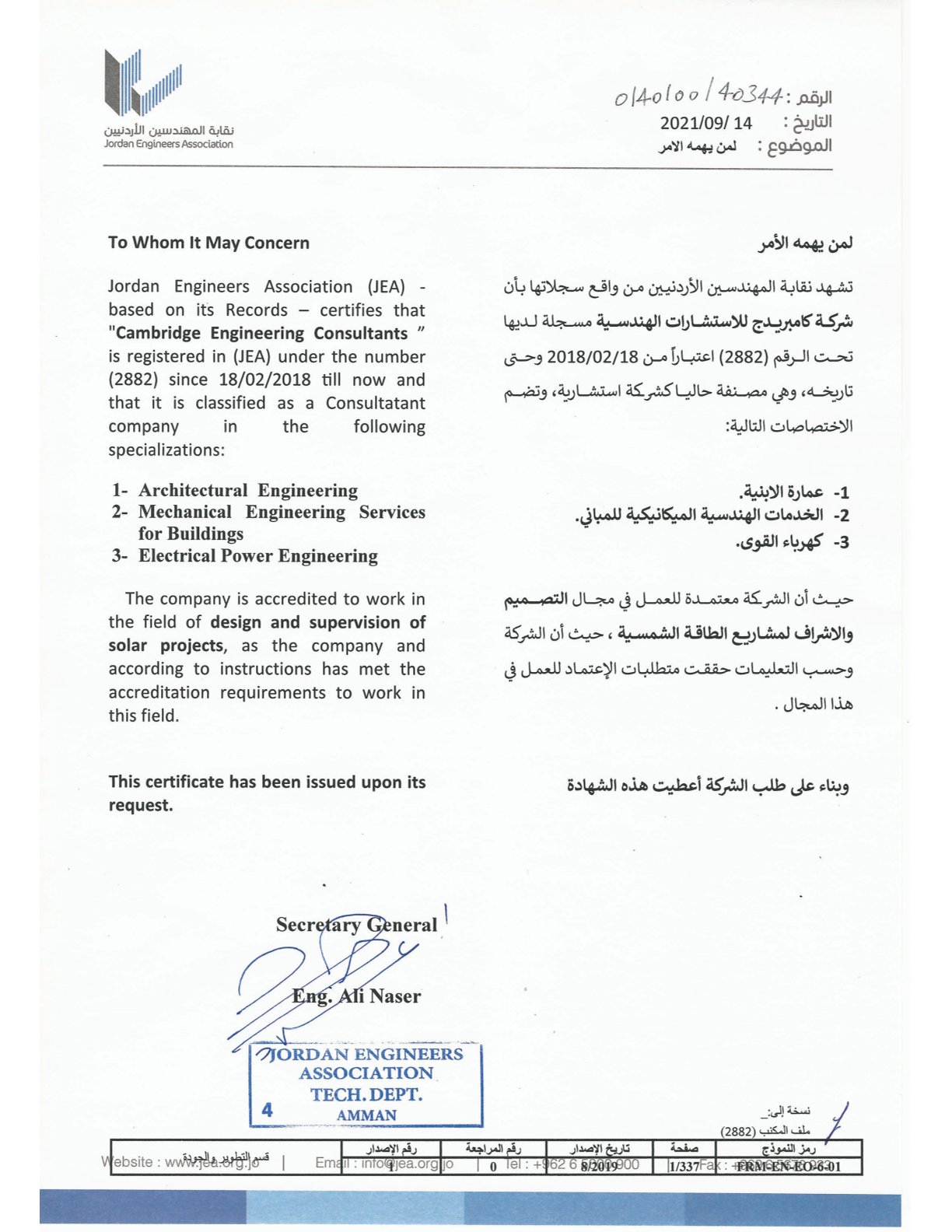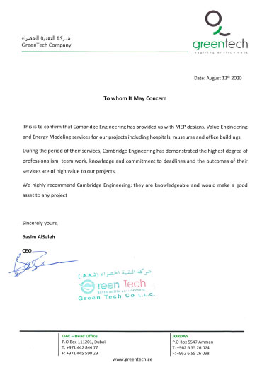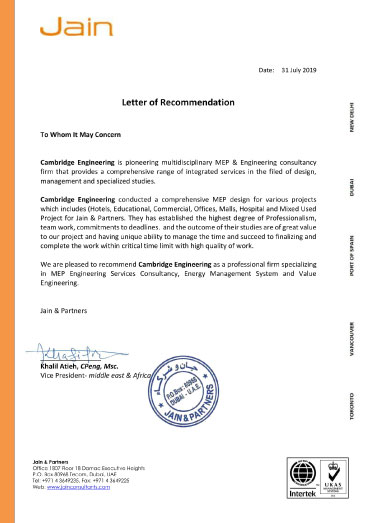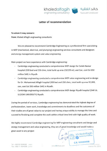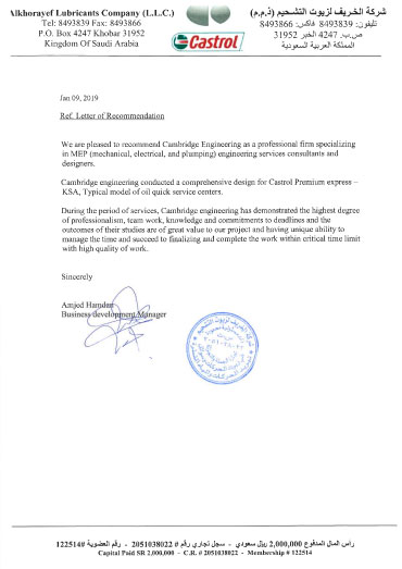 Recommended Cambridge Engineering for their MEP design of oil quick service centers in KSA, highlighting professionalism, speed, and technical ability.